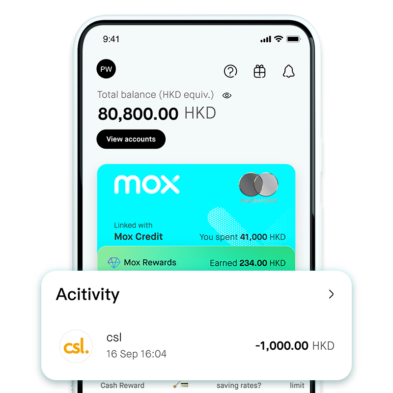 Get an extra HKD1,000 Cash Reward by spending a total of HKD1,000 in one single transaction online or offline at csl Shop or 1O1O Center or subscribe HKT service* with Mox Credit Card within the first 30 days of Mox Credit approval. The Cash Reward will be directly credited to your Mox Account.