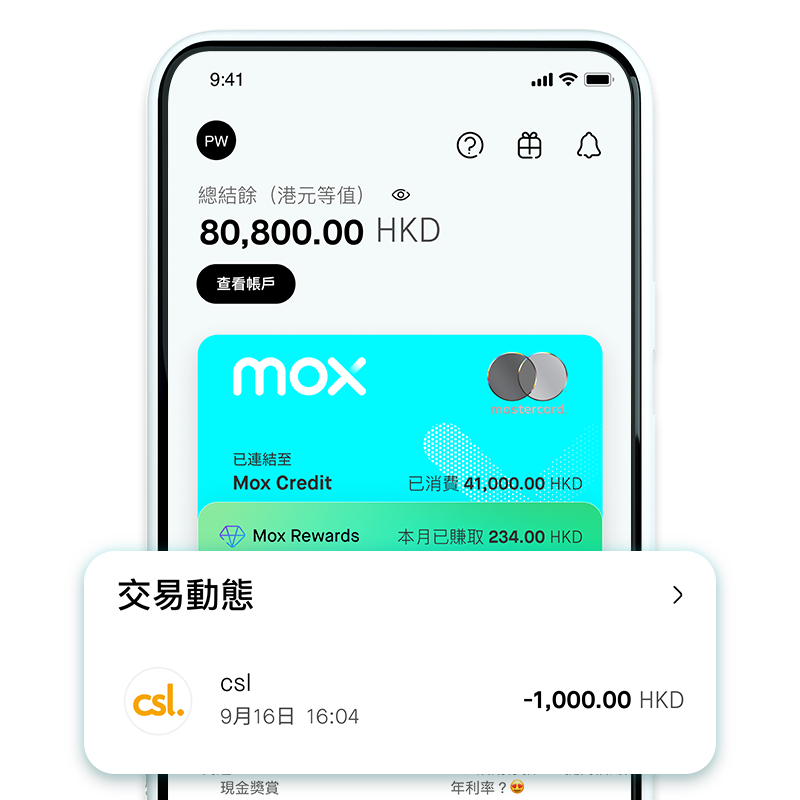於Mox信用卡獲批核當日起計30天內選用HKT服務或在全港任何一間csl專門店或1O1O Center或csl網店*作單次合資格消費滿HKD1,000,即賞你HKD1,000現金,並於交易結算後直入你戶口。